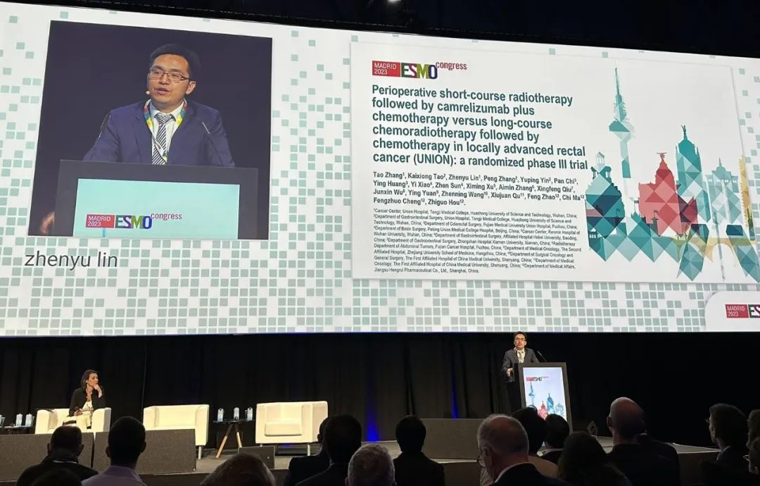 10月21日,九游会ag医药创新药卡瑞利珠单抗的一项研究“新辅助短程放疗序贯卡瑞利珠单抗联合化疗对比长程放化疗序贯化疗治疗局部晚期直肠癌”随机对照Ⅲ期试验(UNION)亮相2023 ESMO大会优选口头报告现场。该研究由华中科技大学同济医学院附属协和医院张涛教授、陶凯雄教授担任主要研究者,华中科技大学同济医学院附属协和医院林振宇教授在大会现场报告了该重磅研究的结果1。此项研究是全球首个评估短程放疗序贯免疫治疗联合化疗治疗局部晚期直肠癌的Ⅲ期研究,已达到主要终点病理完全缓解(pCR),有望为直肠癌患者的治疗提供新策略。