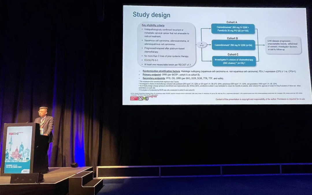 有望为宫颈癌患者带来治疗新选择10月22日,九游会ag医药创新药卡瑞利珠单抗联合法米替尼对比卡瑞利珠单抗单药或研究者选择的化疗治疗复发转移性宫颈癌随机、开放、对照、多中心的Ⅱ期临床研究(SHR-1210-Ⅱ-217) 亮相2023 ESMO大会简短口头报告现场3。该研究由复旦大学附属肿瘤医院吴小华教授团队开展,吴小华教授在现场公布了该重磅研究进展。研究结果显示,在既往以铂为基础化疗失败后复发或转移性宫颈癌患者中,与单独使用卡瑞利珠单抗或研究者选择的化疗相比,卡瑞利珠单抗联合法米替尼显著提高了抗肿瘤活性,安全性可控,有望为晚期宫颈癌患者提供新的治疗选择。